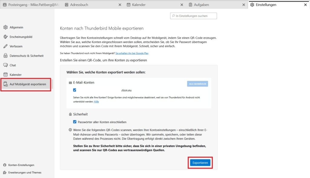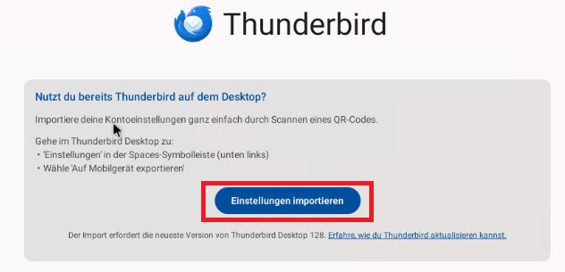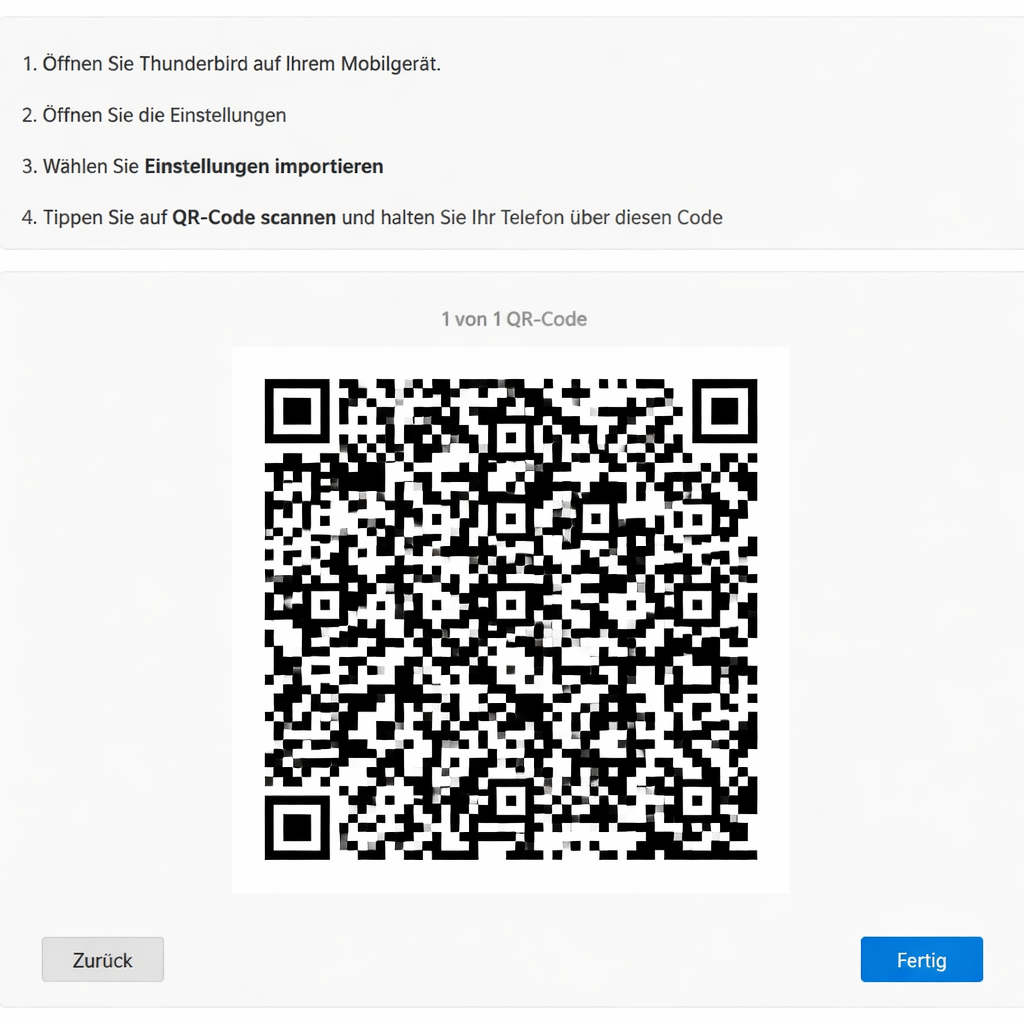 Scannen Sie nun den QR-Code auf Ihrem Rechner, ggf. müssen Sie der Thunderbird-App den Zugriff auf Ihre Kamera genehmingen. Alle Einstellungen werden automatisch übernommen, Fertig!